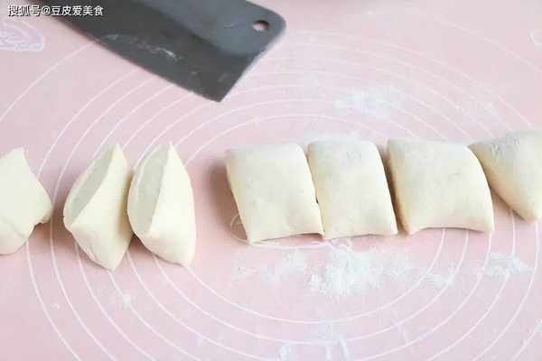 5、面团发酵至2倍大时,放案板上,揉搓几下排气,搓成长条状,再切成大小均等的剂子。