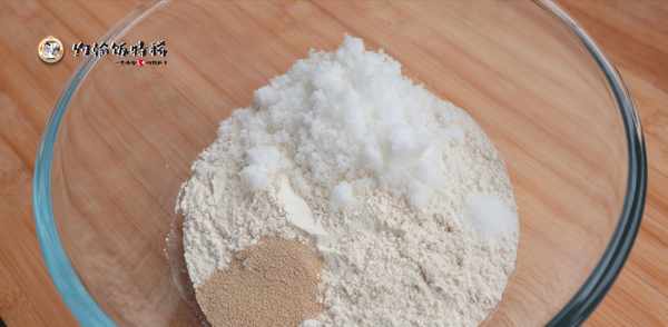 (1)将300克无筋面粉倒入一个大碗中,加入4克酵母、60克糖和2克盐以增加面筋,拌匀。