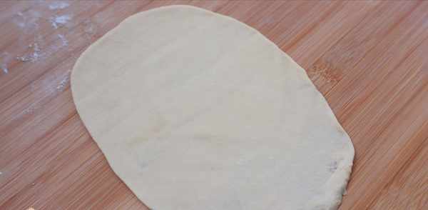 (9)全部揉好后,取第一份面剂,先压扁,然后擀成一个大饼子,底部压薄一点,这样更容易合。