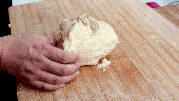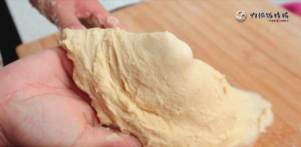 (4)揉好后放在案板上继续揉。用一只手按压面团的一端,用另一只手来回推动面团。反复揉面团10分钟。拉伸后,有一层厚膜,如下图所示。这款面包的含水量非常好,所以揉起来很粘。不要放弃,边揉边用刮刀刮粘板。