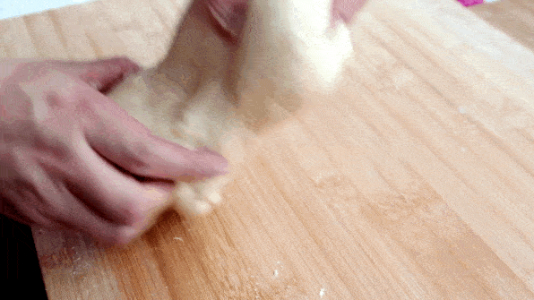 (7)案板上撒些干面粉,防止粘连。取出面团,放在上面。可以用手按压面团,排除空气,也可以用擀面杖将空气来回滚动,直到恢复到面团原来的大小。然后把面团擀成长条,把面团分成16等份。