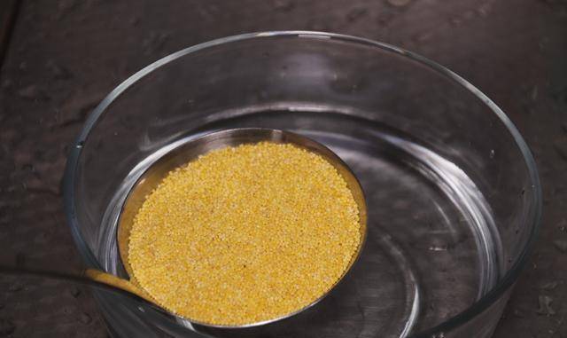 首先,我们将准备好的小米倒入碗中,然后加入适量的水,朝一个方向轻轻搅拌,使灰尘、米糠等杂质浮起,然后倒掉,再加入清水浸泡约约15分钟