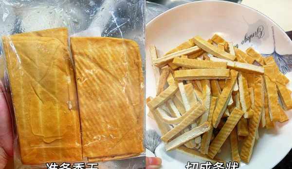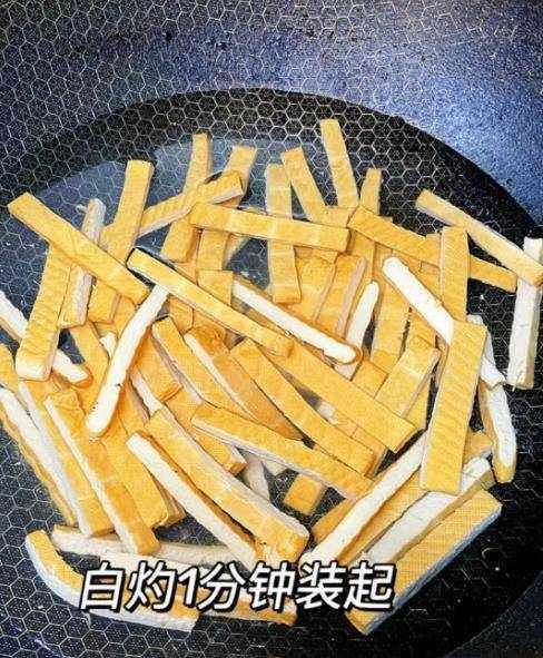 第三:将豆腐干放入容器中,加入适量冷水浸泡,捞出切条,还可以将豆腐干焯水,这样豆腐干更有弹性,不会降低营养价值.