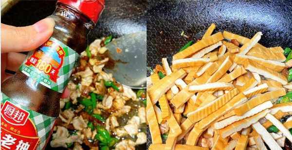 第六:加一勺老抽上色,倒入焯好的豆腐干,大火快速翻炒片刻,加入少许生抽和蚝油,加盐和鸡精调味,最后加适量芹菜,快速翻炒几下,装盘出锅,这道芹菜豆干烧肉就做好了。