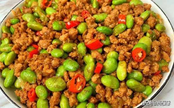 3、另起油锅,放入葱姜蒜炒香,加入毛豆炒熟,加少许盐,加入肉末,最后加入小米辣,翻炒均匀即可。
