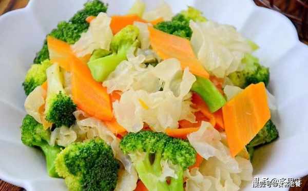 材料:西兰花1个、盐5克、胡萝卜50克、干银耳5克、大蒜3瓣