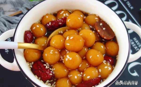 2、锅中倒入少许清水,放入红糖和红枣,小火熬至红糖融化,放入糯米丸子继续中小火熬,熬至汤汁微微浓稠关火,撒上白芝麻即可