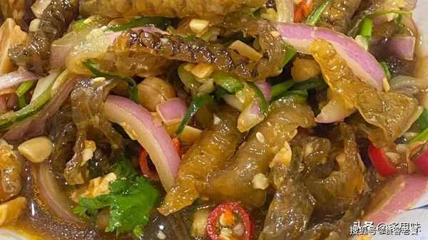 5、 鱼皮切丝,加入配菜,淋上酱汁,加入花生,拌匀,放入冰箱冷藏3小时。