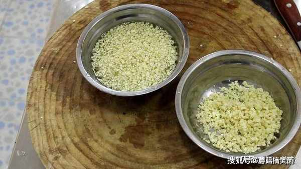 准备大蒜一把剁成蒜末,分别盛放在两个盆中,蒜末的比例是2:1,在蒜末量较多的盆中加入一勺清水浸泡备用。浸泡的目的是防止蒜末油炸时变黑。