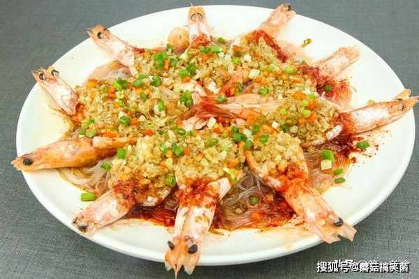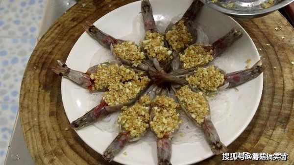 然后,准备一个盘子,把泡发的粉丝摆放在盘底,把虾逐个放在粉丝上进行摆盘。