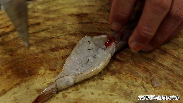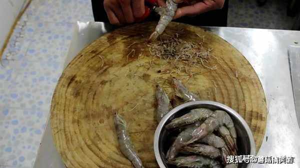 先在虾背上划一刀去除虾线,下刀时要偏一点以免划断虾线,全部处理好以后,把虾再次清洗干净控水备用。