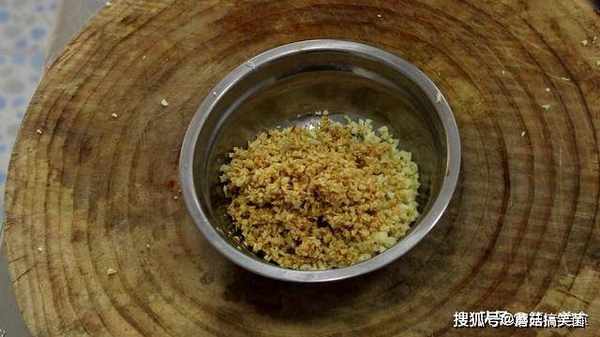 锅内加入适量的植物油,把蒜末倒入滤勺中控干水分,油温升至五成热,油面轻微冒烟时,把蒜末浸在油锅中炸2分钟左右。炸至金黄时捞出,这一步的目的是炸出大蒜的香味,增加菜品天然的香味。