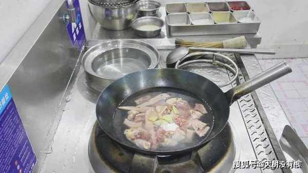 现在我们把鸭子焯一下水。锅里加入清水,把鸭子凉水下锅。丢入几片姜片,倒入料酒。