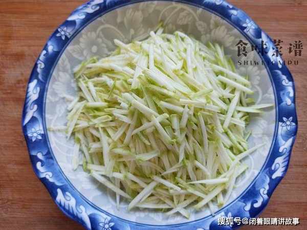 2、准备一个大盆,把西葫芦洗净,去掉头尾,外皮保留就行,用擦丝器擦成细丝,越细长越好,建议大家斜着擦,又长又细。