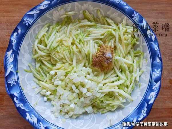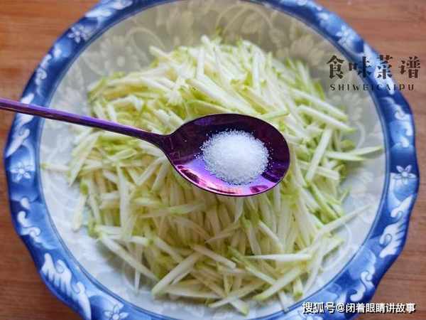 3、舀小半勺食盐,均匀地撒在上面,翻拌均匀,腌制十分钟,逼出西葫芦丝内部的水分,这样有利于口感脆爽,更好吃。