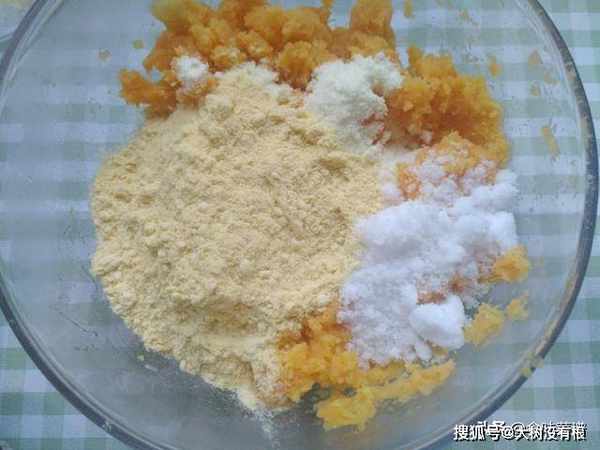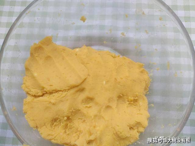 3、把玉米面、糖、奶粉,倒入红薯泥里,揉成光滑面团。