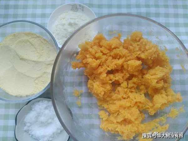 2、准备玉米面150克,奶粉20克,白糖20克,红薯捣成泥。