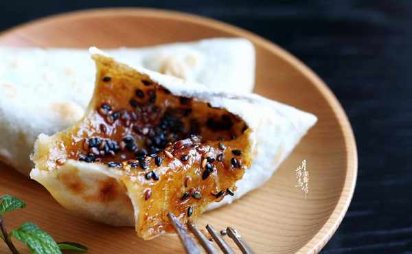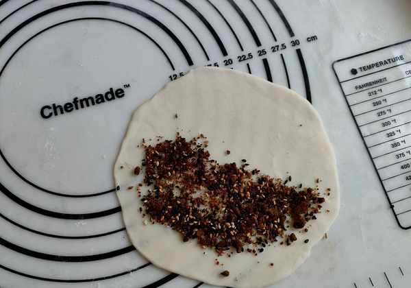 越薄越好,把红糖馅放在一半的面团上。不要用太多,否则会太甜。