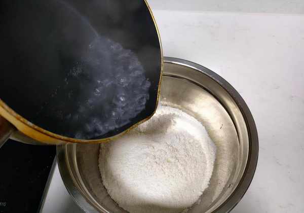 首先,烧一锅开水。煮沸后,慢慢倒入面粉中,边加边用筷子搅拌。