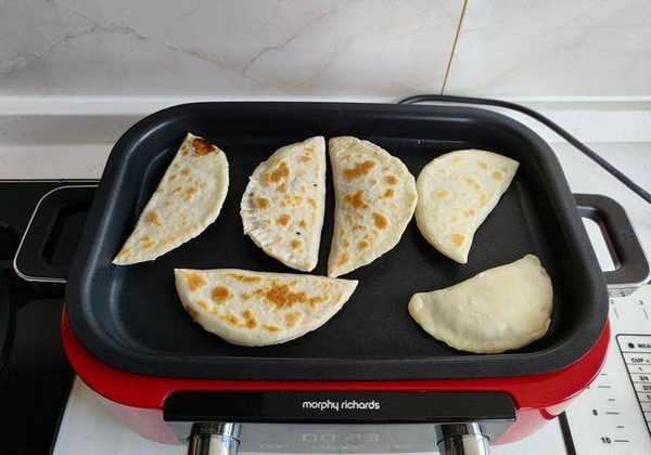大约2分钟后,你会看到薄饼鼓起来了,把它们翻过来,还有一点点金褐色的痕迹,继续烤一会儿。可以清楚的看到饼皮的颜色已经变白了,熟了。