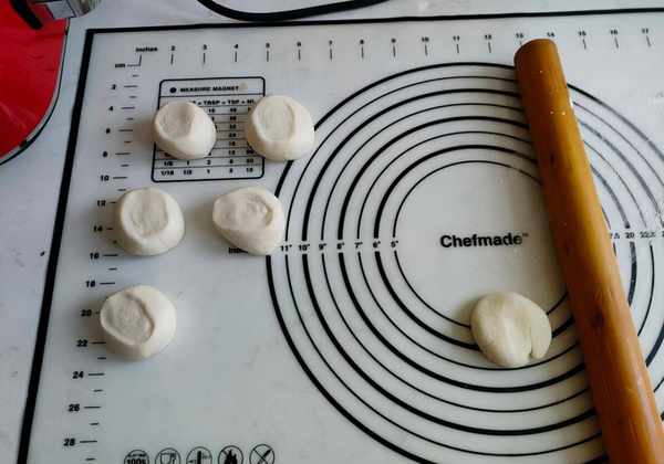 将醒好的面团分成合适的大小。我做的很小,所以我拿了一半的面团,擀成长条,做了几个小的。