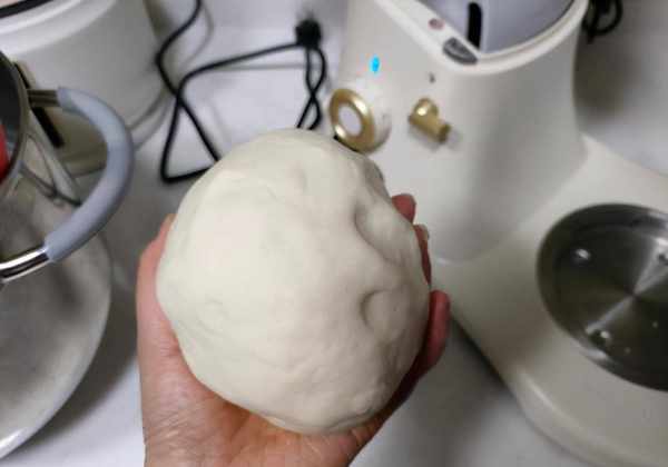 由于水分含量高,立式搅拌机中的面团很粘。没关系,用手拿出来,揉两下,就顺滑了。