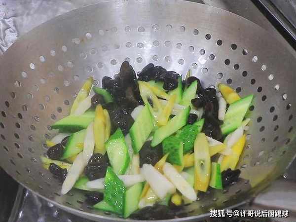 锅内烧水,冷水放入竹笋煮1分钟去除苦涩味,再放入木耳和黄瓜继续焯烫10秒钟倒出来,快速用清水冲洗几下保持食材清脆的到口感。