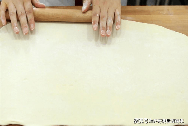 1个小时以后,我们扒开面团看一下,里面都是蜂窝眼,说明面团已经发酵好了。在案板上撒一层面粉,把面团拿出来揉一揉排排气,面团揉光滑以后,用手压扁,擀成长方形的面饼。