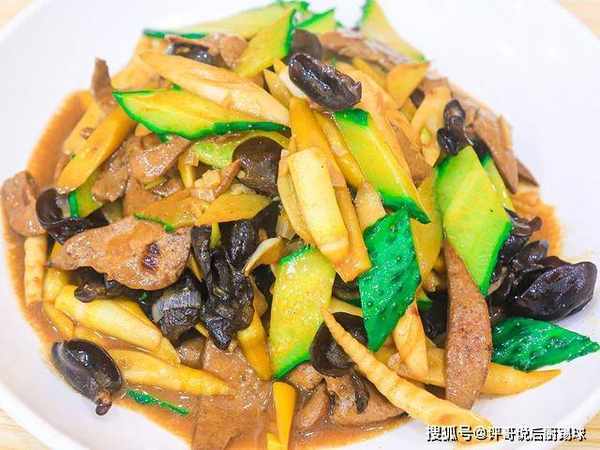 准备一小把干木耳放入清水中泡发,然后沥干水分备用;一根黄瓜去除两头,然后切成菱形片;一把水发竹笋洗干净后斜刀切成片备用;大葱破开切成葱花,大蒜切成片,生姜切成菱形片放在一起备用;碗中放入食盐2克、鸡精2克、白糖少许提鲜、老抽3克上色、蚝油5克、再倒入适量的清水,加入一小勺淀粉搅拌均匀备用。