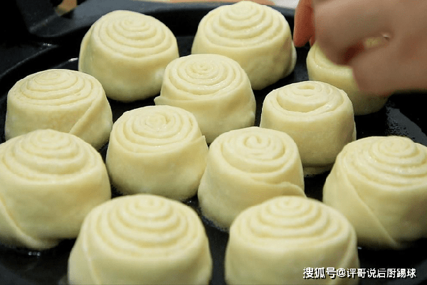 拿起饼坯揉得圆润一些,把最外层的饼皮压在下面,做好的饼坯用保鲜膜盖住,再次发酵10分钟,发酵至饼皮微微鼓起即可,这样烙出来的饼更加蓬松暄软。