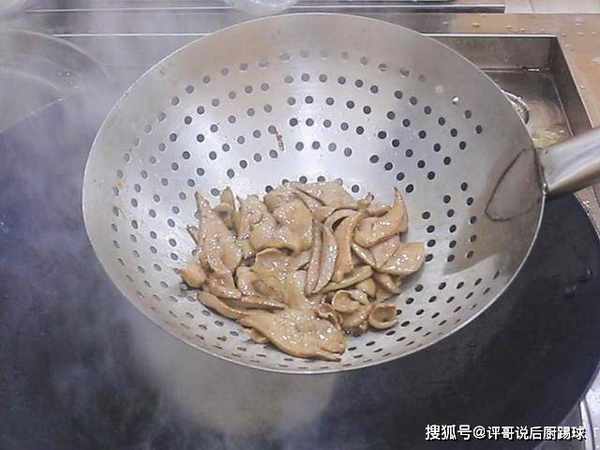 起锅烧油,油温四成热时倒入腌好的猪肝,快速滑油10秒钟,猪肝变色以后立即倒出保持其鲜嫩的口感。