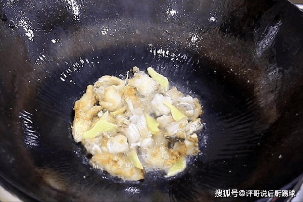 把锅烧热,油温五成热时,放入鱼骨开小火慢慢煎,不停地摇晃锅让其均匀受热,再放入几片生姜去腥,鱼骨煎香煎至两面金黄时。