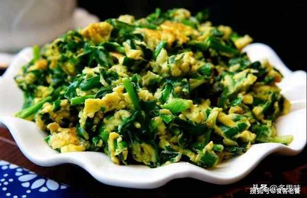 4、转大火,油温烧至冒烟后,将鸡蛋和韭菜的混合液倒入,先不要翻炒,底部凝固后再用铲子翻炒,全部炒熟结块即可。