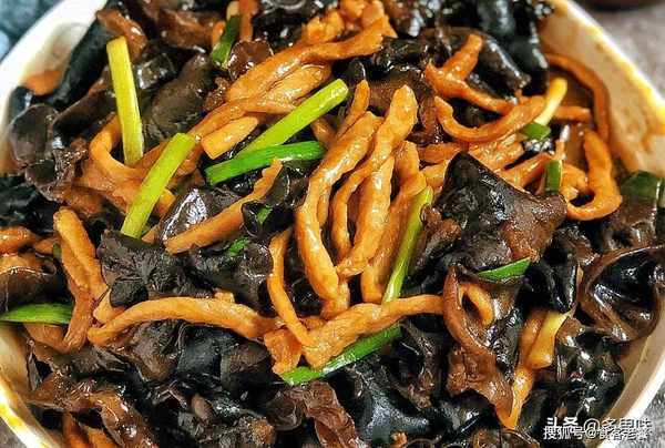3、炒锅放油烧热,放入腌好的肉丝翻炒均匀,放入黑木耳翻炒均匀,倒入调味汁翻炒均匀后放入蒜苗段再次翻炒均匀后起锅。