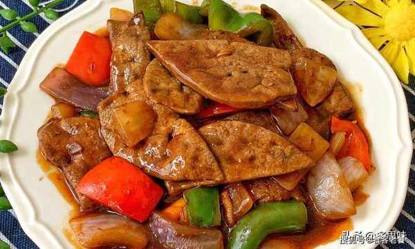 5、热油姜蒜爆香,青红椒炒至断生,加入猪肝大火快炒,倒入酱汁炒匀关火。