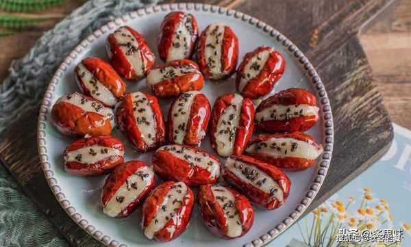 3、把糯米小条塞入去核的红枣里头,然后撒上黑芝麻