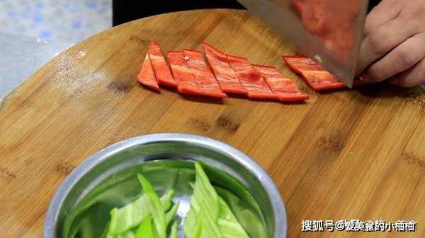青椒两片,红椒一片,都切成菱形片青椒红椒配色,比较好看。