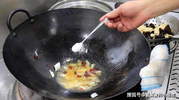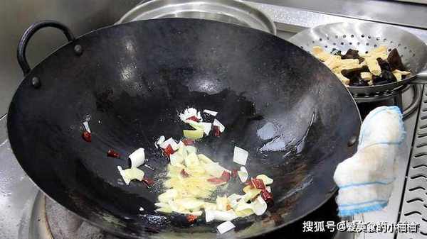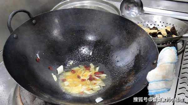 接下来,我们开始烹饪:锅内烧油,放入葱姜蒜,抓入干辣椒2克一起翻炒。