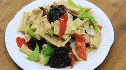 放入腐竹,木耳翻炒几下,把调料翻匀再放入青红椒片,翻炒至青红椒断生,淋入少许水淀粉,淋入水淀粉能够使食材和调料更好的融合在一起,翻匀收汁以后,即可出锅装盘。
