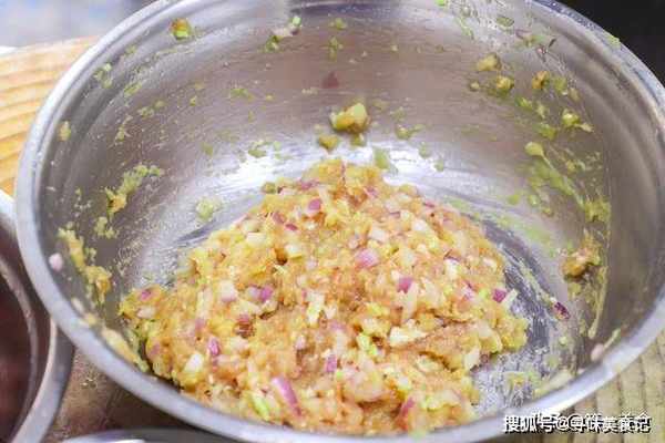 3.顺着一个方向搅拌上劲,让肉馅吸收料汁入味,这个搅拌过程要持续3分钟,打出肉馅的胶质,再放入一小把淀粉,继续搅拌至肉馅出浆,淀粉能够锁住肉馅中的水分,保持鲜嫩的口感。