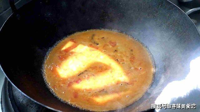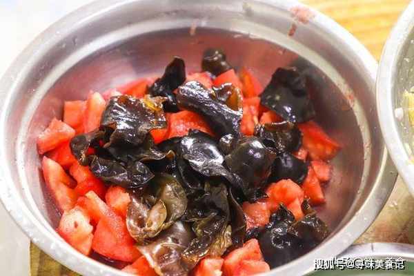 4.食材全部准备好以后我们开始烹饪,锅内烧油,油烧热以后倒入番茄丁和木耳,加入少许食盐多翻炒一会,充分炒出番茄的红汁,从锅边淋入适量清水开始调味。
