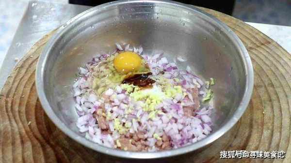 2.猪肉200克剁成肉末,洋葱半个切成丁,生姜一小块切成姜末和肉末放在一起,加入食盐2克,鸡粉1克,胡椒粉1克,蚝油5克提鲜,再打入一个鸡蛋,鸡蛋能使肉馅口感更嫩。