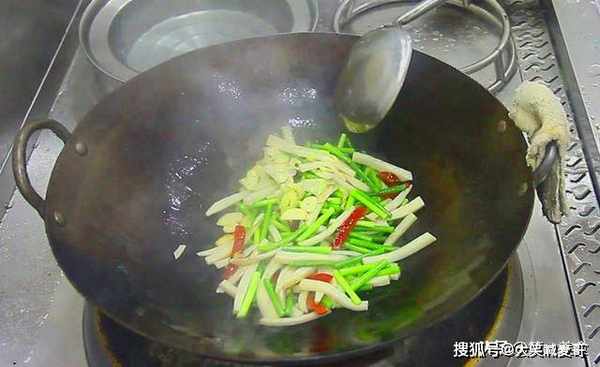 炒出香味,倒入杏鲍菇和蒜苔快速翻炒。