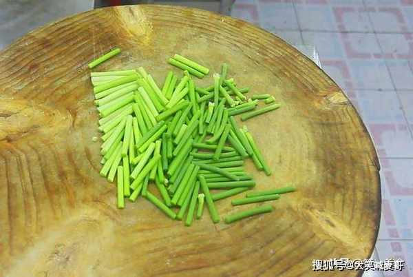 准备一把蒜苔,清洗干净,切成2厘米左右的段,放在盆里。