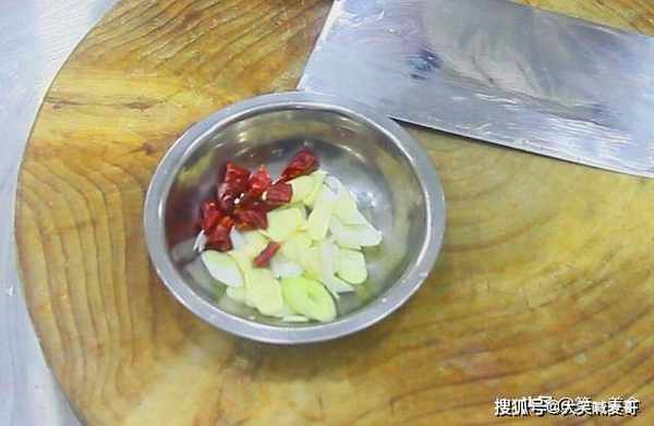 红椒切成宽条,大葱白切成马蹄片,大蒜切成片,抓一把红干椒,放在盆里。