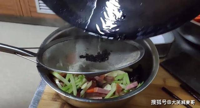 8、放入火腿、木耳、大蒜片等食材,添加食盐、香油、鸡精等调料。