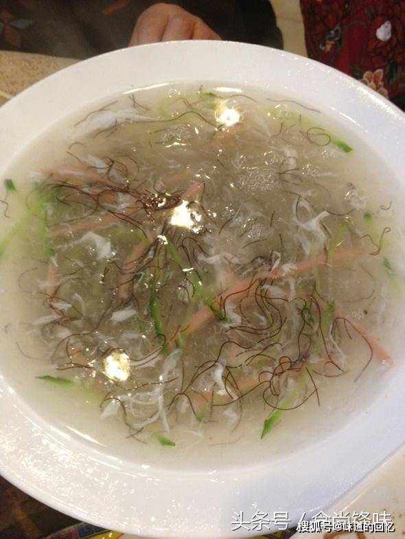 图为西湖牛肉羹,上网查了一下,汤里加入了淀粉和蛋白,看起来形容似湖水,所以西湖为名,每人一碗是不可能了,要用勺喝,香淳润滑、鲜美可口。