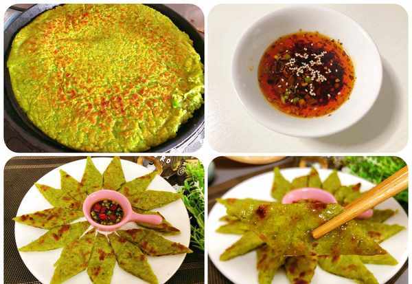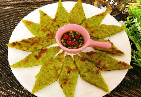 (7)把豆饼切成菱形小块装盘,中间放上料碟,豆香味浓郁的煎豆饼就做好了,软软的,带有豆子的颗粒感,越嚼越香