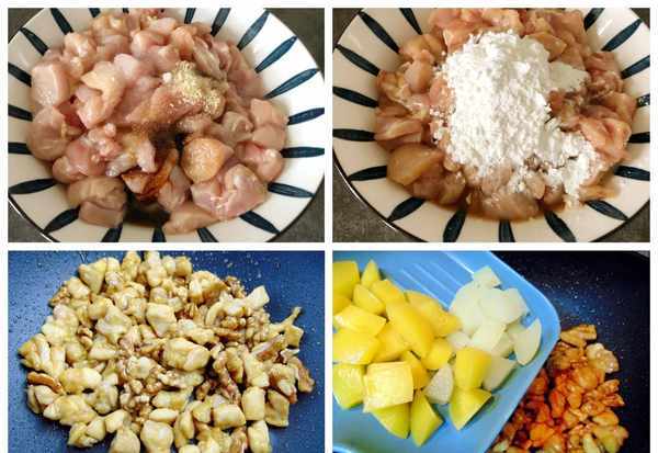 (1)先把鸡腿去皮拆骨,然后洗一下切成小方丁,加1个鸡蛋清,适量盐,料酒,生抽,鸡精,少许淀粉搅匀,腌制一刻钟