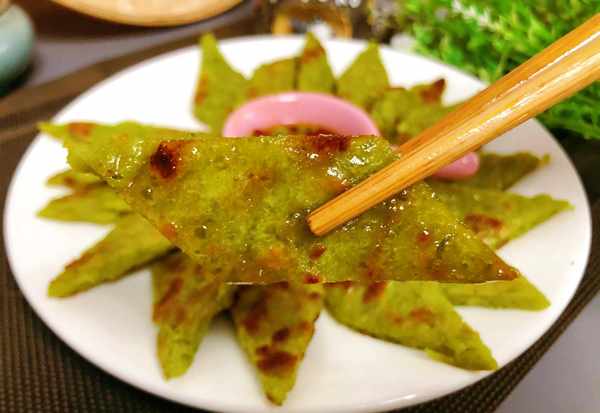 (5)电饼铛倒油预热,把豌豆糊倒进来,上面也刷一层油,煎5分钟,然后翻面再煎5分钟